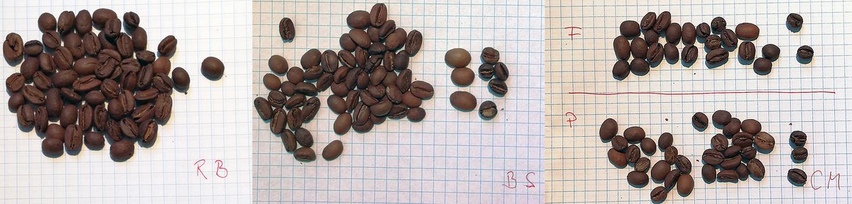 A kávészemeket szemügyre véve megállapítottuk, hogy elég különböző termések kerültek össze. Az apró szemű peaberry és a közepes méretű szemek egyaránt megtalálhatóak voltak. Ebből adódóan az apró szemek sötétebbre pörkölődtek.